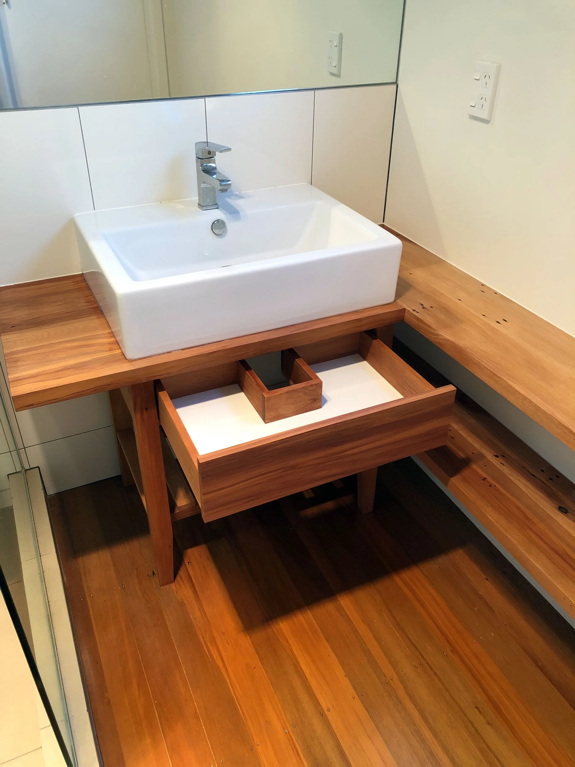 “Freestanding” style vanity and floating shelves built around an existing wallhung basin in this ensuite. Built from native NZ Rimu saved from a previous renovation to the house. Soft-close drawer runners from Hettich